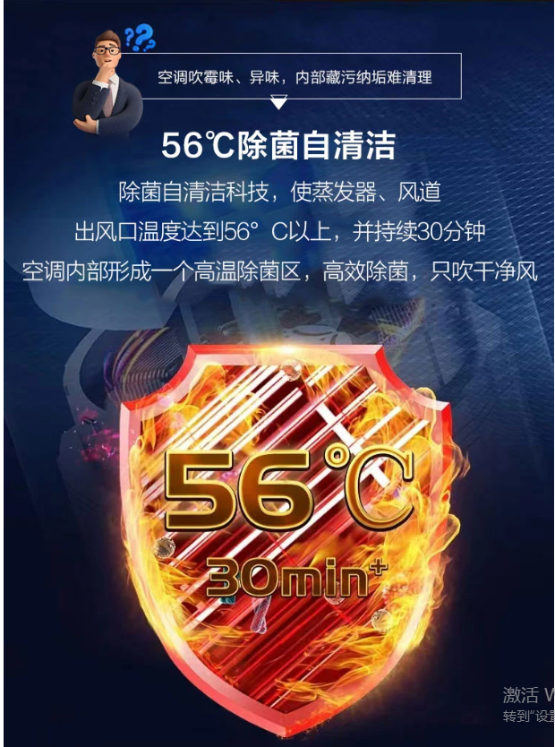 空調(diào)夏天降溫慢,冬天升溫慢,開機等半天,這款靜悅空調(diào)采用KST+PKC+PID變頻技術(shù),三維一體極致控溫,啟動快、運行穩(wěn)、控溫準(zhǔn),40S速冷,80S速熱。搭配強勁壓縮機,強勁動力,速冷速熱。還帶有56℃除菌自清潔功能,出風(fēng)口溫度達(dá)到56℃以上,并持續(xù)30分鐘,空調(diào)內(nèi)部形成一個高溫除菌區(qū),高效除菌,只吹干凈風(fēng)。次空調(diào)采用上下分段式豎百葉,可根據(jù)用戶需求獨立控制,采用專利導(dǎo)風(fēng)板應(yīng)用高爾夫球面導(dǎo)流科技,20個大波浪導(dǎo)板,1800個高爾夫球面,分散氣流,送風(fēng)更舒適。?